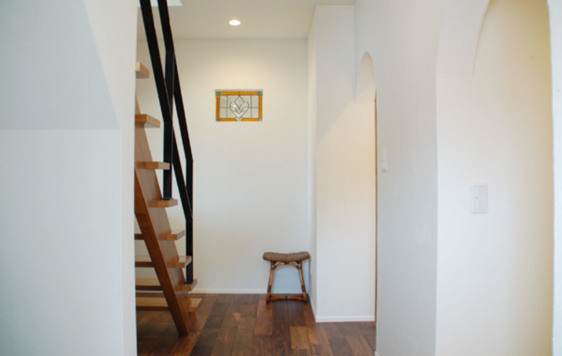 写真の事例では、キッチン前には造作カウンター、その隣にはアールの下がり壁がかわいい飾り棚を配置。