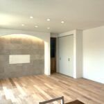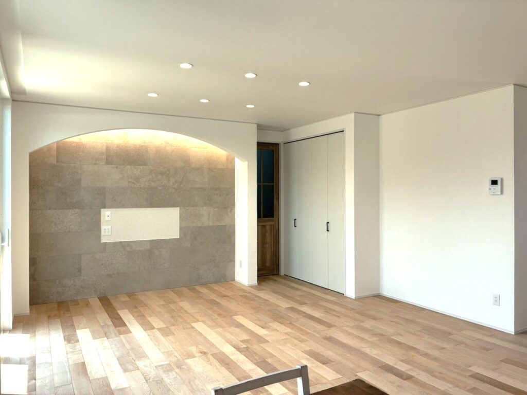 22帖の広々としたLDKには、アーチのふかし壁とタイル