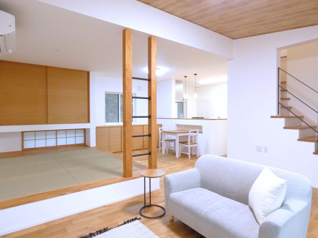 LDKの中心には化粧柱を設け、リビングと小上がりの畳スペースをやさしく仕切りました。