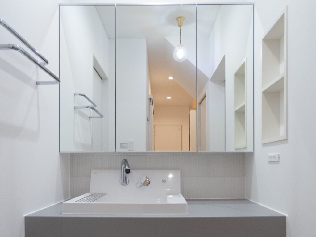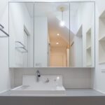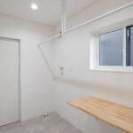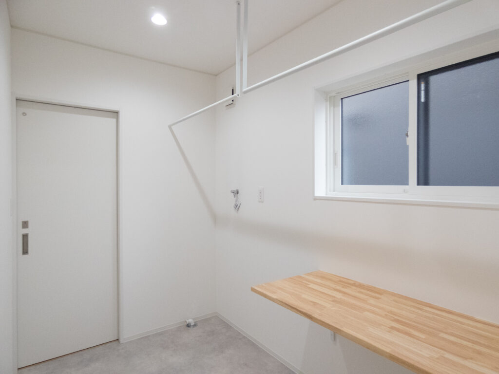洗面所を中心に、FCL・サンルーム・浴室が一直線に並ぶ動線計画で