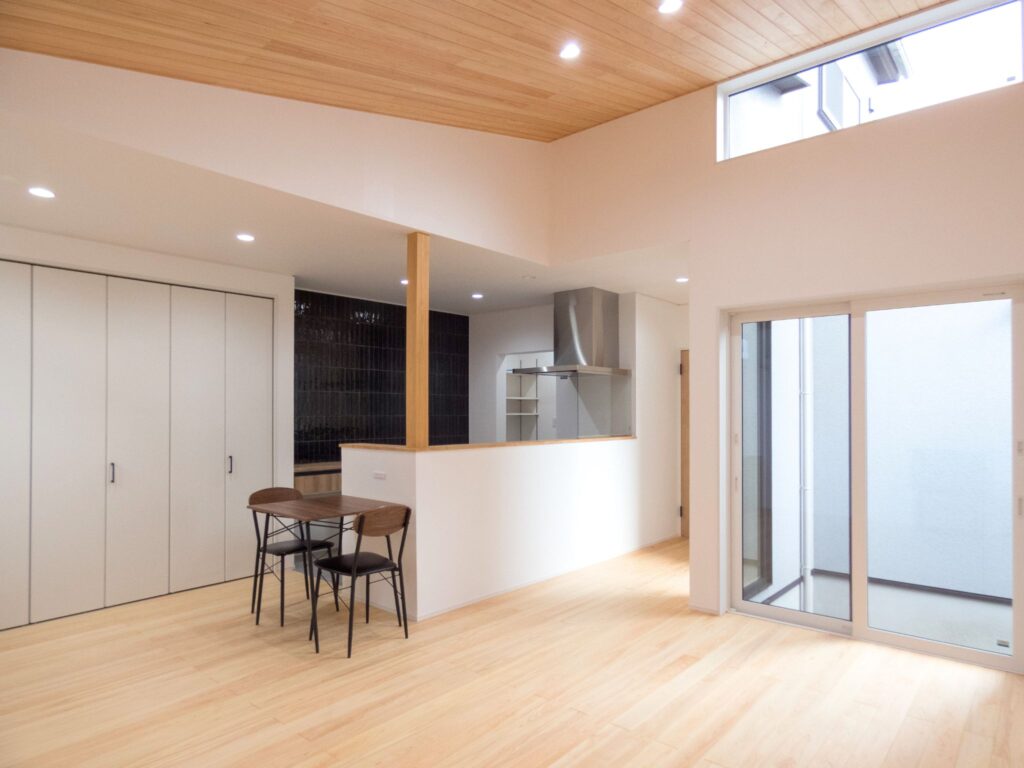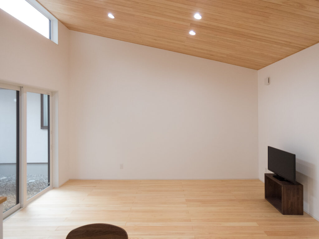 リビングは勾配天井とL字型の窓配置で、広がりを感じる設計に。